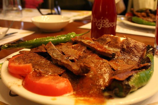 Iskender or Alexander Kebap is one of the most famous meat foods of Turkey that prepared from thinly cut grilled lamb basted with hot tomato sauce over pieces of pita bread and generously slathered with melted sheep butter and yogurt.